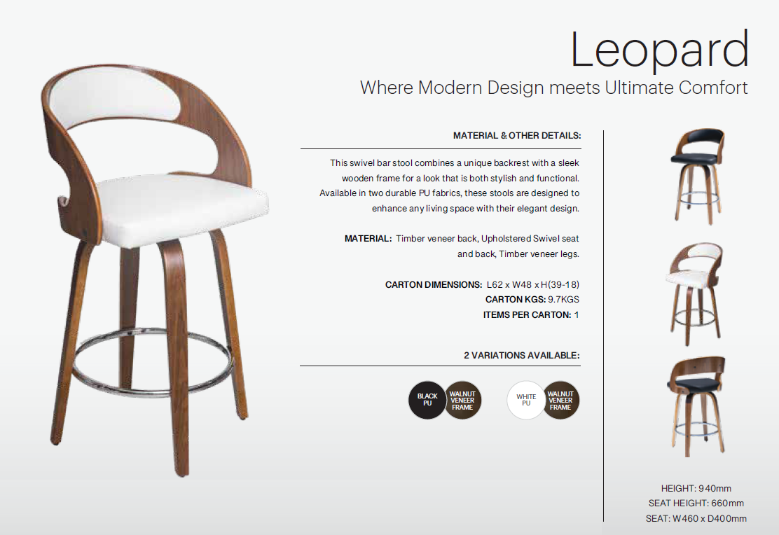 Add a wild touch to your kitchen with the Leopard Swivel Kitchen Counter Barstool! Featuring sleek black or white PU vinyl upholstery on a rich walnut veneer base, this stool combines style and comfort. The shiny chrome footring and smooth 360-degree swivel make it perfect for lively conversations and easy movement. Bring some fun and flair to your space with this playful, eye-catching barstool!