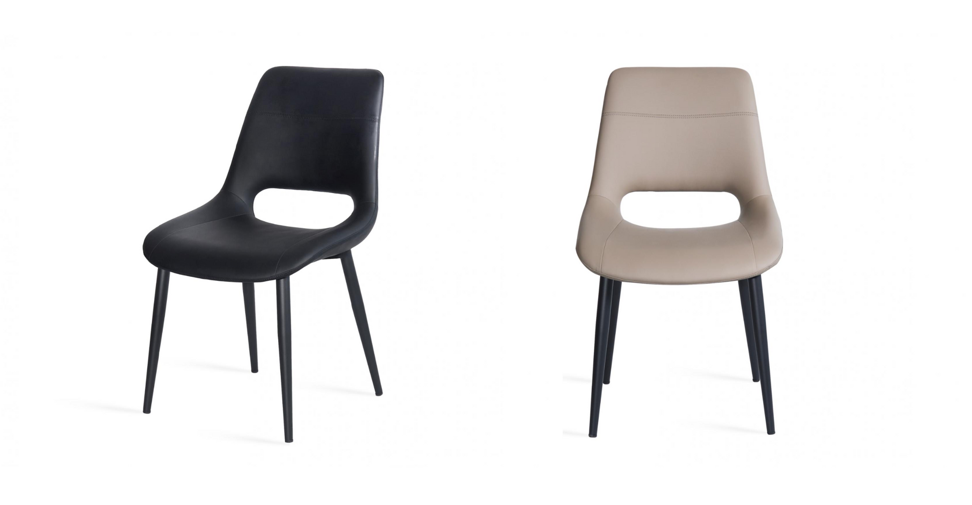 Bring flair and comfort to your dining area with the Vienna Dining Chair sold in sets of 2. Choose between chic taupe or classic black PU vinyl for a look that suits your style. The black powder-coated metal legs add a sturdy yet sleek finish, making these chairs both practical and playful companions for any meal or gathering.
